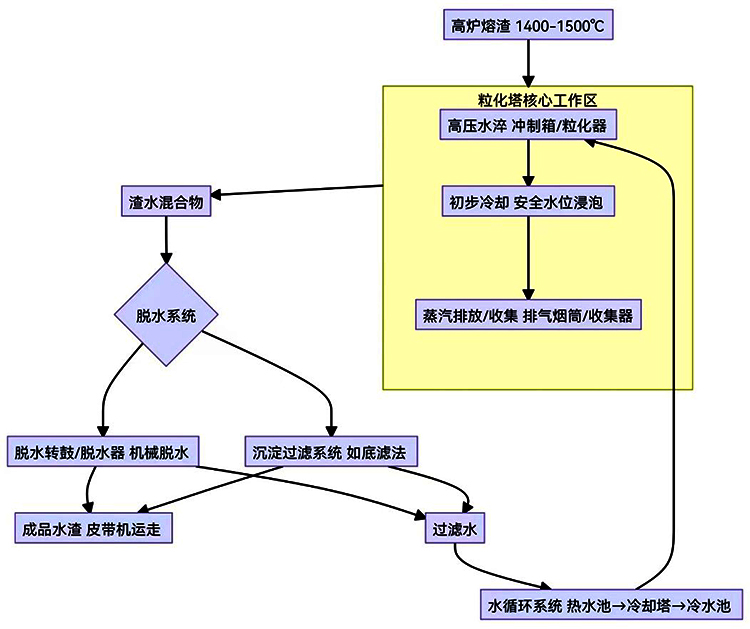 粒化塔是高炉炼铁渣处理系统的核心设备,主要用于将高温熔融炉渣快速冷却、粒化为可回收利用的水渣,同时实现渣水分离与水资源循环。其工作流程大致如下: