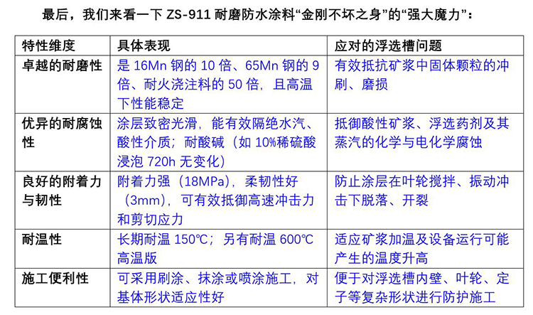 总结:辉钼矿浮选槽的失效是化学腐蚀、电化学腐蚀与物理磨损共同作用的结果,其环境苛刻,腐蚀与磨损相互促进。选择ZS-911耐磨防水涂料作为“防护伴侣”,必能“相濡以沫,永结同心,一生相伴”。