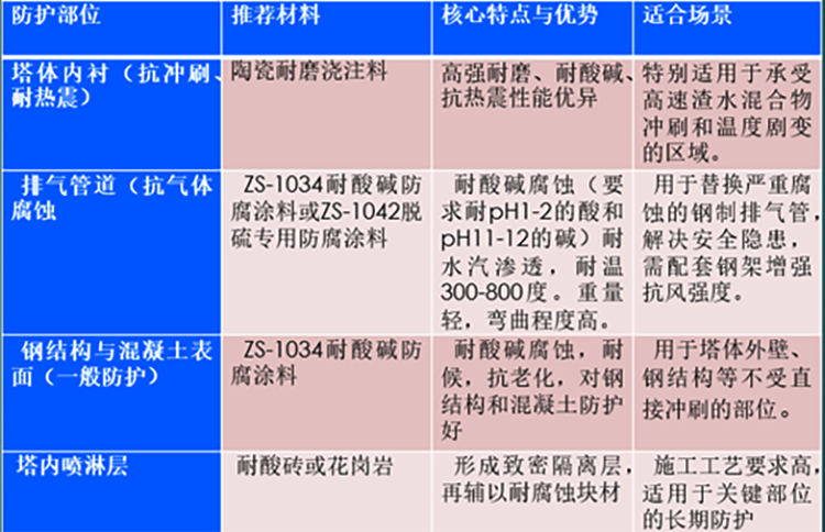 志盛威华ZS-1034耐酸碱防腐涂料和ZS-1042脱硫专用防腐涂料耐温可以达到300-850度,涂层硬度高,抗冲刷,耐PH值1-14范围内的酸碱及酸碱交替腐蚀,附着力好,韧性高,线膨胀系数与基材匹配度高,能应对干湿、冷热、酸碱频繁变化的工况。粒化塔排气塔中低温段、酸碱波动频繁、冷凝液腐蚀区域。