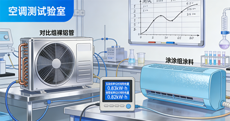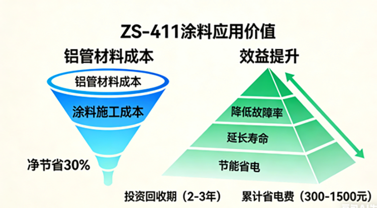 实验数据与工程实践证明,在空调铝管蒸发器、冷凝器上涂刷ZS-411辐射散热涂料(150℃),可通过强化辐射换热、提升防腐性能,使铝管换热器在核心性能指标上媲美铜管产品,同时实现显著的节能效益与成本优势。