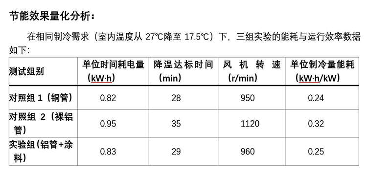 数据表明,裸铝管空调单位时间耗电量较铜管高15.9%,降温时间延长25%;而涂刷涂料后,铝管空调单位时间耗电量仅比铜管高1.2%,降温时间与风机转速基本接近铜管水平,单位制冷量能耗仅相差0.01kW·h/kW。按居民电价0.55元/kWh、夏季制冷120天、每天运行8小时计算,实验组空调年耗电量为806.4kW·h,较裸铝管空调节省115.2kW·h,年节省电费63.36元,节能效果显著。